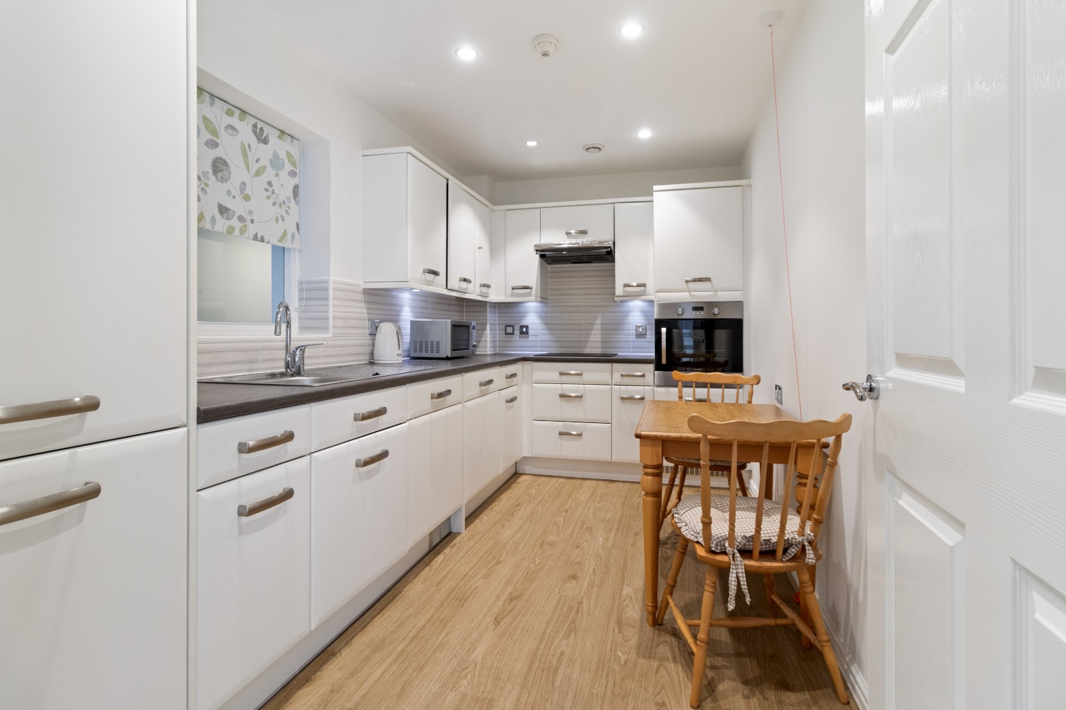 Apartment 204 is on the second floor accessible either via the lift or stairs. Entrance door in to the apartment opens in to the welcoming spacious and light hallway comprising door to airing cupboard and doors off to all rooms. Breakfast kitchen to the left fitted with a range of white base and eye level units, work surface, stainless steel sink unit, electric oven, hob and extractor over, integrated fridge and freezer, integrated dishwasher and washing machine, ceiling spotlights. Room for a table and chairs, window to communal hallway.