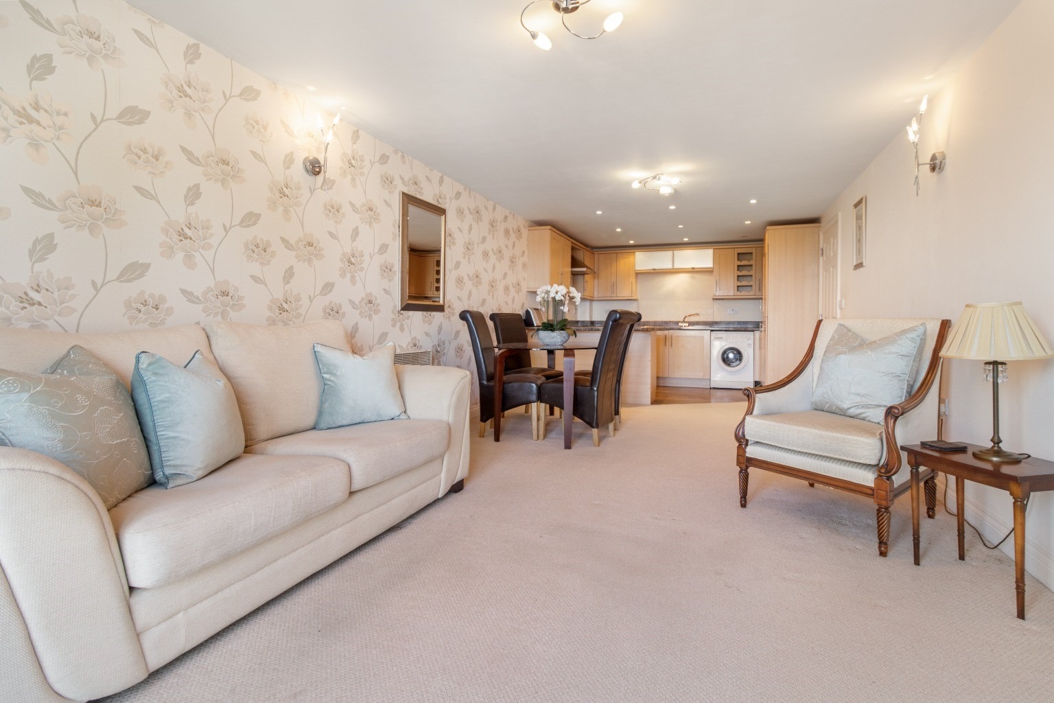 This is a light and bright spacious apartment within Scotland House and has fantastic rural views. The property is entered into a spacious reception hallway with a double wardrobe. Off the hallway is the open plan living area with a modern fitted kitchen. The kitchen comes with a fridge, freezer, oven and hob. The property has two bedrooms, however they have currently been knocked into one to create a large bedroom with dressing area. There is a further built in wardrobe in the second bedroom, which could also be used as a home office area. The shower rooms consists of a modern white suite.