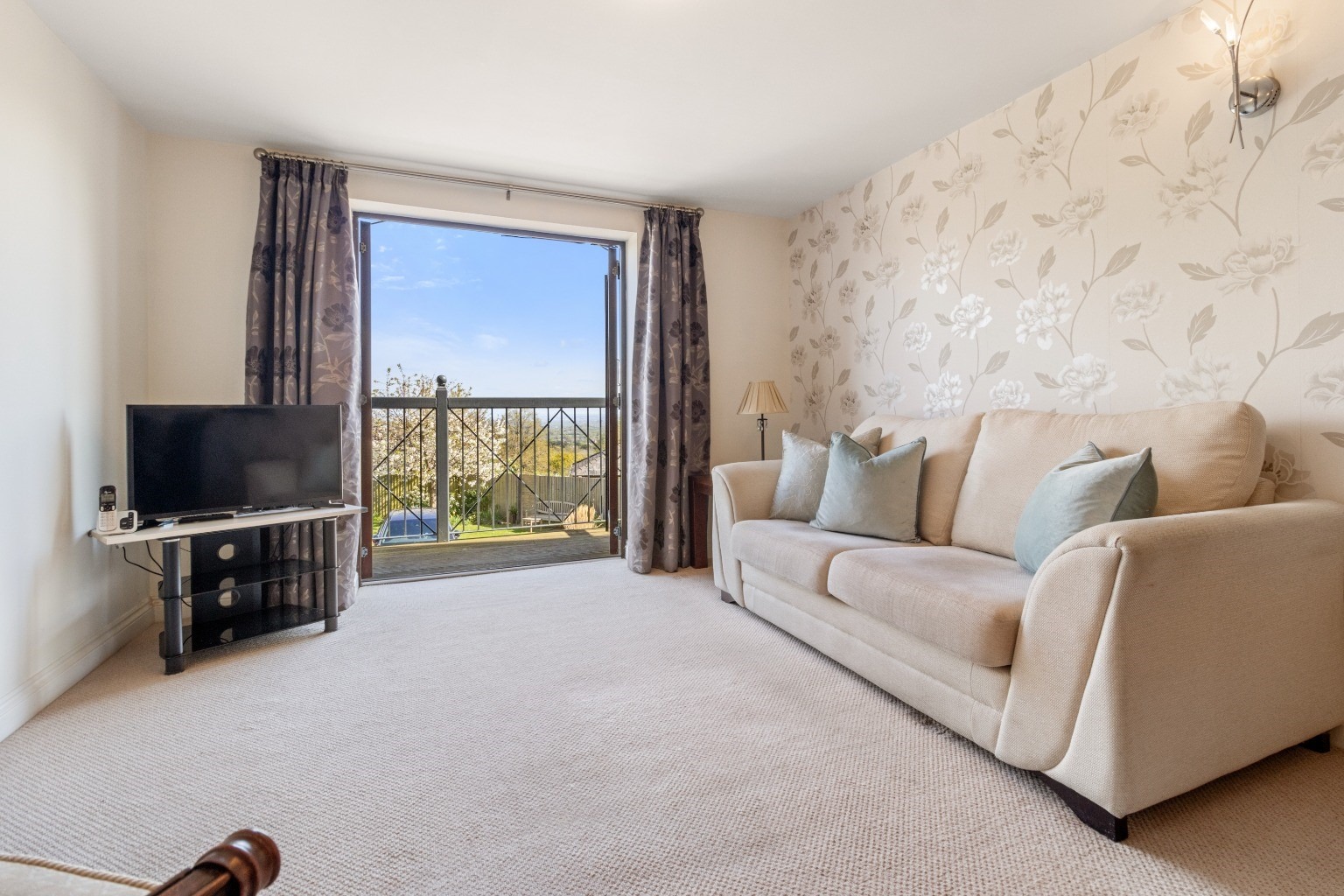 A balcony runs the full length of the property and has three double doors onto it.