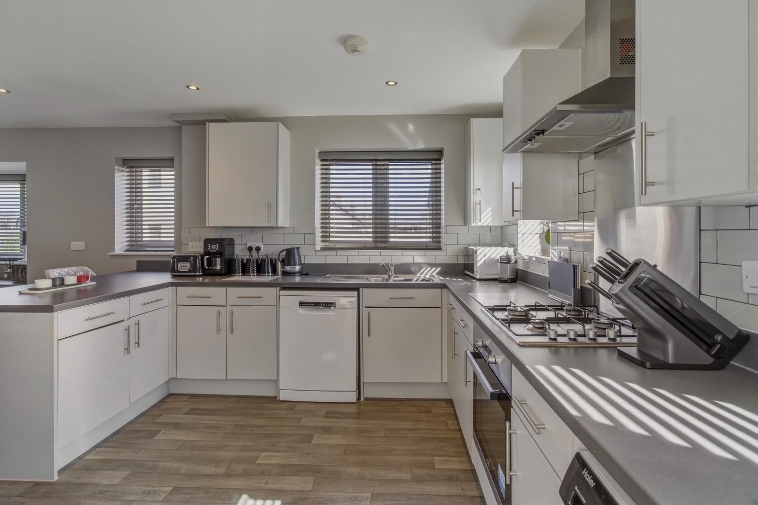 Composite entrance door to spacious and welcoming reception hall comprising staircase to the first floor, useful under stairs cupboard and double doors off to the living room and kitchen/diner, grey vinyl tiled flooring. Door to cloakroom with low level WC and pedestal wash basin and grey flooring continued. Spacious and light living room with dual aspect windows to front aspect and double doors to rear opening out on to the garden, two ceiling light points. Spacious kitchen/dining/family room with generous dining space and triple aspect windows to front, side and rear aspect, vertical radiator, grey flooring continued from the hall. The kitchen area is comprehensively fitted with a range of base and eye level units, grey work surface, one and a half bowl sink unit with mixer tap, gas hob, electric oven with extractor hood over, space and plumbing for dishwasher and washing machine, wall mounted Ideal combination boiler. Double glazed door to side to the garden.