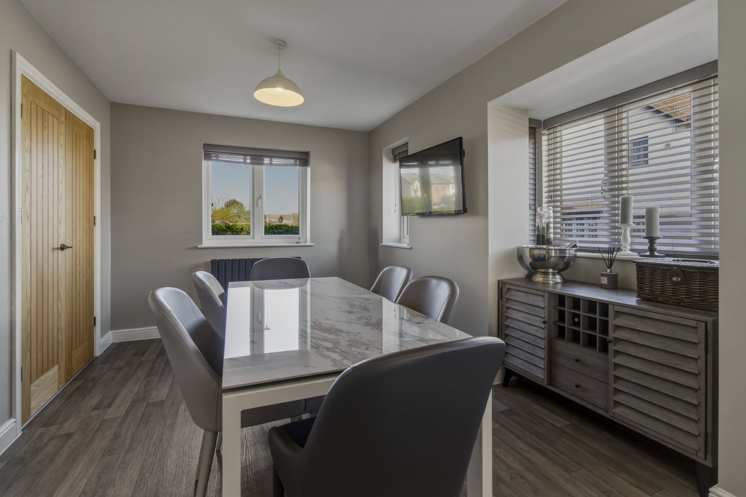 Staircase from the hall leads up to the generous landing with feature half height panelling to the walls, wooden doors to all rooms and a useful storage cupboard with shelving and radiator. The master bedroom benefits from dual aspect side and front windows with lovely views to the Malverns and a Juliet balcony to the front. Door to ensuite shower room with Bristan electric shower, low level WC, pedestal wash basin, ceiling spotlights, obscured window to rear, radiator, laminate flooring. Three further good sized light and airy bedrooms. Bedroom 4 has door to storage cupboard over the stairs. The family bathroom has a panelled bath with shower over, pedestal wash basin and low level WC. Ceiling spotlights, heated towel rail, shaver light point, grey flooring.